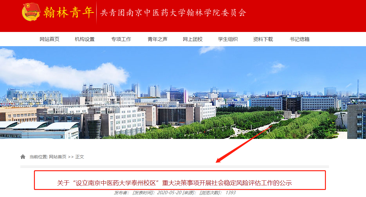 2020年5月20日,共青团南京中医药大学翰林学院委员会发布“关于设立南京中医药大学泰州校区重大决策事项开展社会稳定风险评估工作的公示”。文章表示,“泰州市与南京中医药大学在多年合作共建南京中医药大学翰林学院的基础上,拟合作共建南京中医药大学泰州校区”。