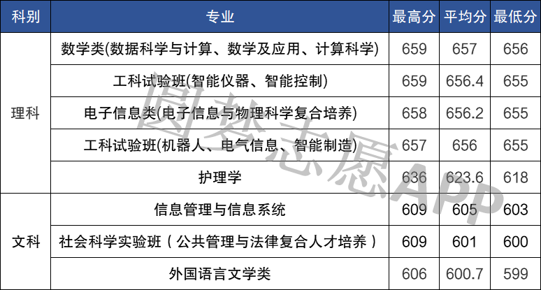 通过上表可以发现,电子科技大学在四川2019年录取分数最低的理科专业为护理学,最低分为618分。而文科专业则为外国语言文学类,最低分为599分。