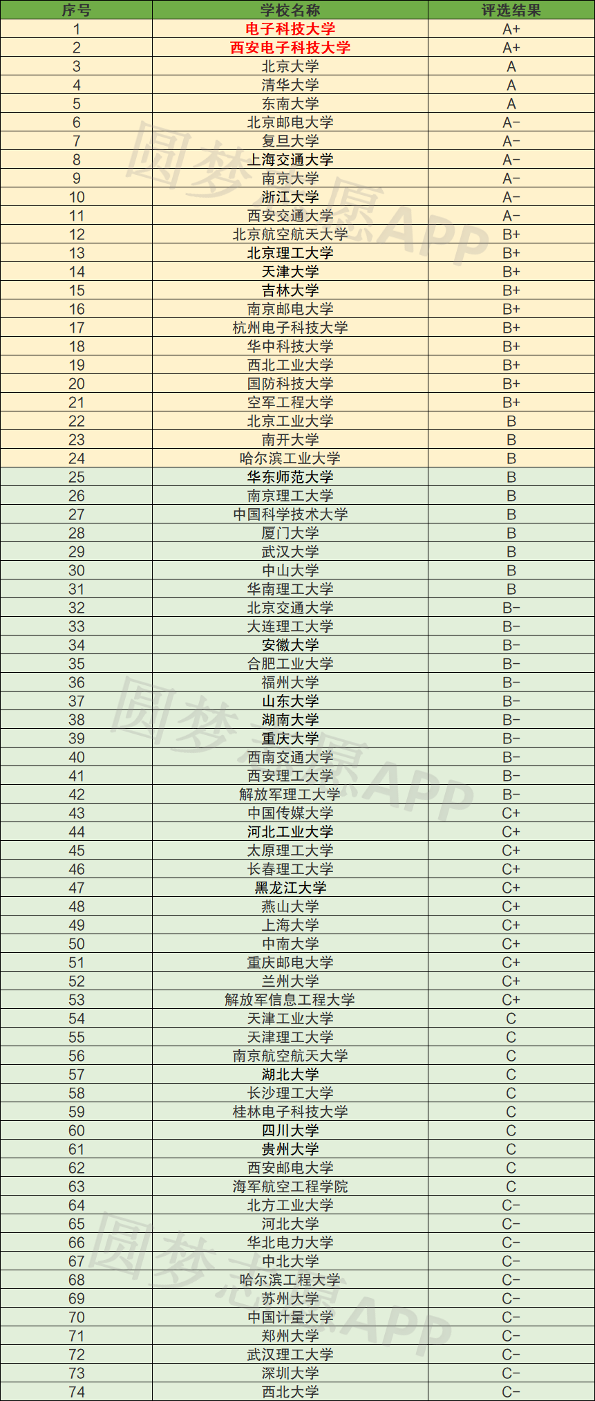 由于教育部第四轮学科评估是目前国内公认最权威的学科实力档次划分,且集成电路专业曾属于电子科学与技术一级学科,所以这里我整理了第四轮学科评估中电子科学与技术的评估结果,可作为集成电路高校排名的参考,共74所。具体榜单如下: