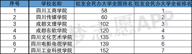 小编整理了四川省内民办大学在校友会的排名情况,省内排名最高的民办大学是四川工商学院,其他民办大学排名具体如下:
