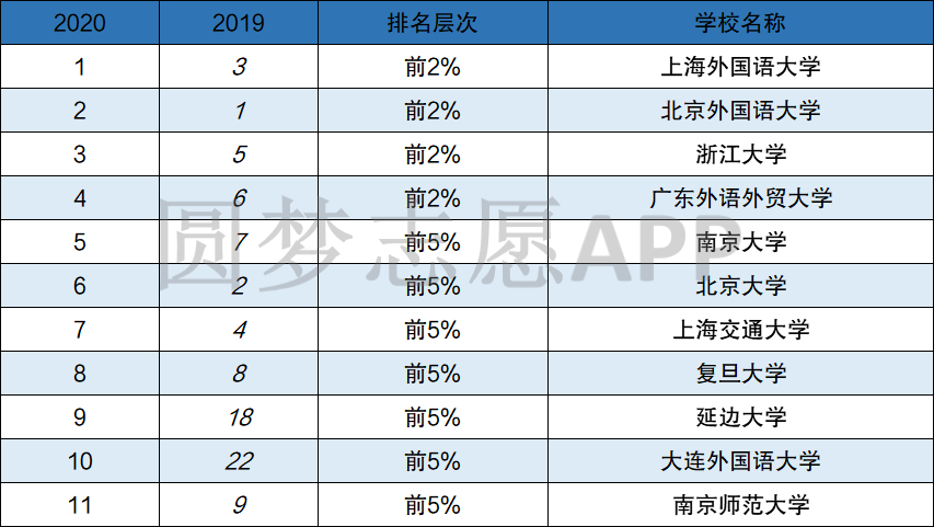 根据软科2020年中国最好学科排名——外国语言文学可见,目前排名前三的分别是:上海外国语大学、北京外国语大学、浙江大学。其中大连外国语大学、延边大学两所院校进步最大,而北京大学、上海交通大学两所院校相较2019年有所退步。下面是排名前5%的院校情况: