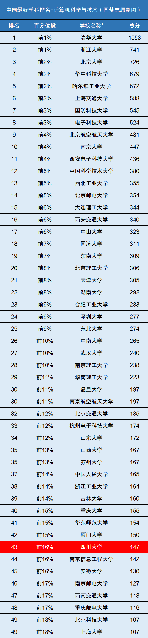 根据软科中国最好学科排名(计算机科学与技术)可知,四川大学的计算机专业在全国高校中排名第43名,相对于学校的综合实力与排名来说,这个专业的排名委实是不算高。