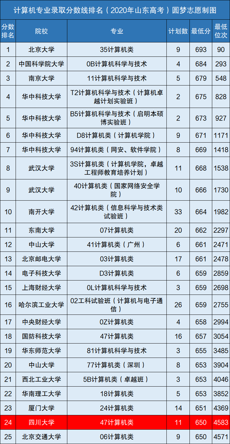 根据山东省教育招生考试院公布的2020年全国高校招录数据可知,按照录取分数线的高低排名,四川大学的计算机类专业排在全国第24名,其最低分为650分、最低录取位次为4583名。