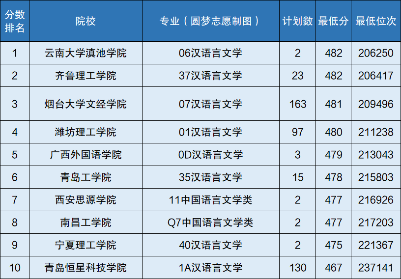 2.齐鲁理工学院,汉语言文学专业投档线为482分,最低位次为206417名;