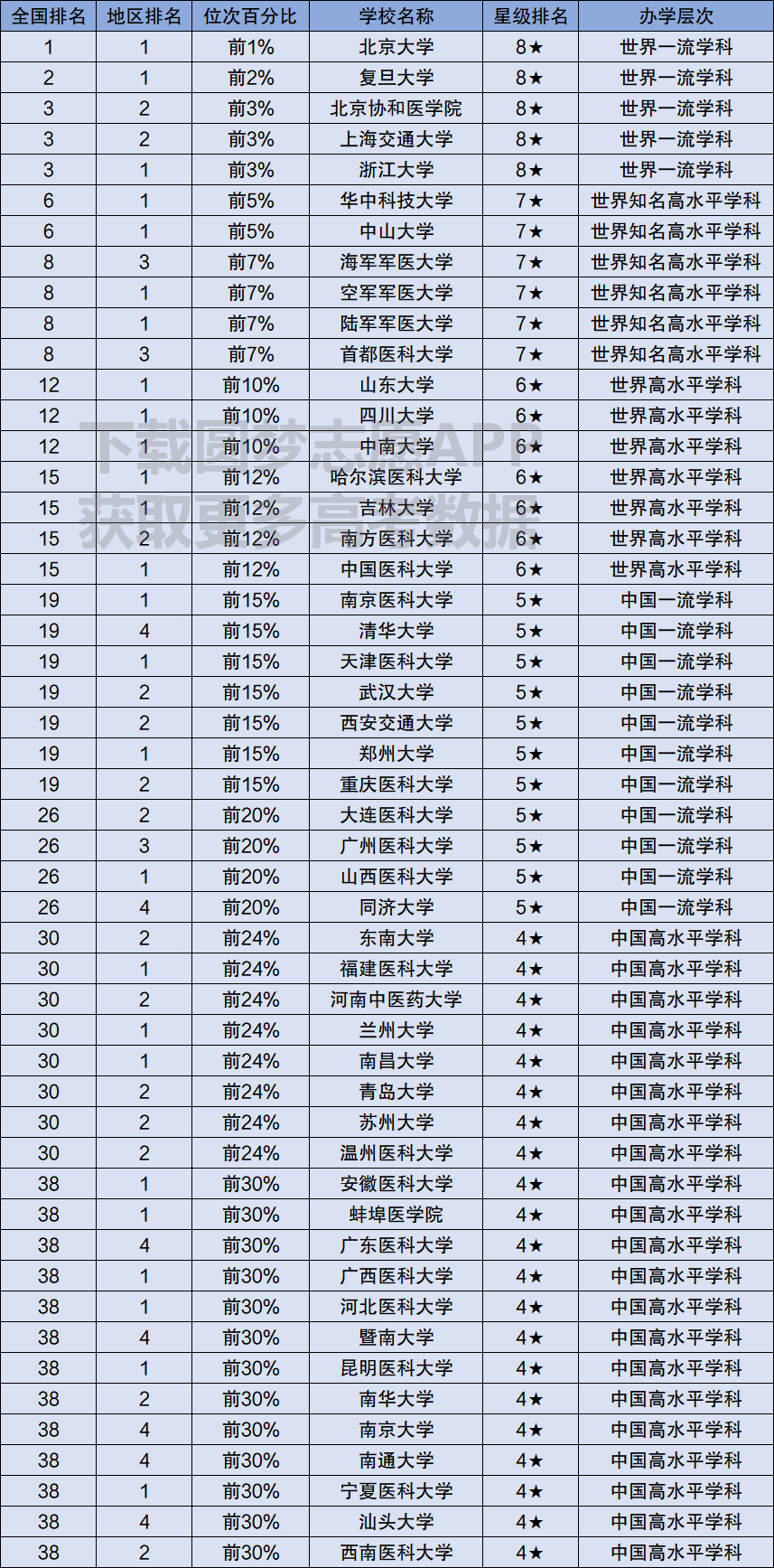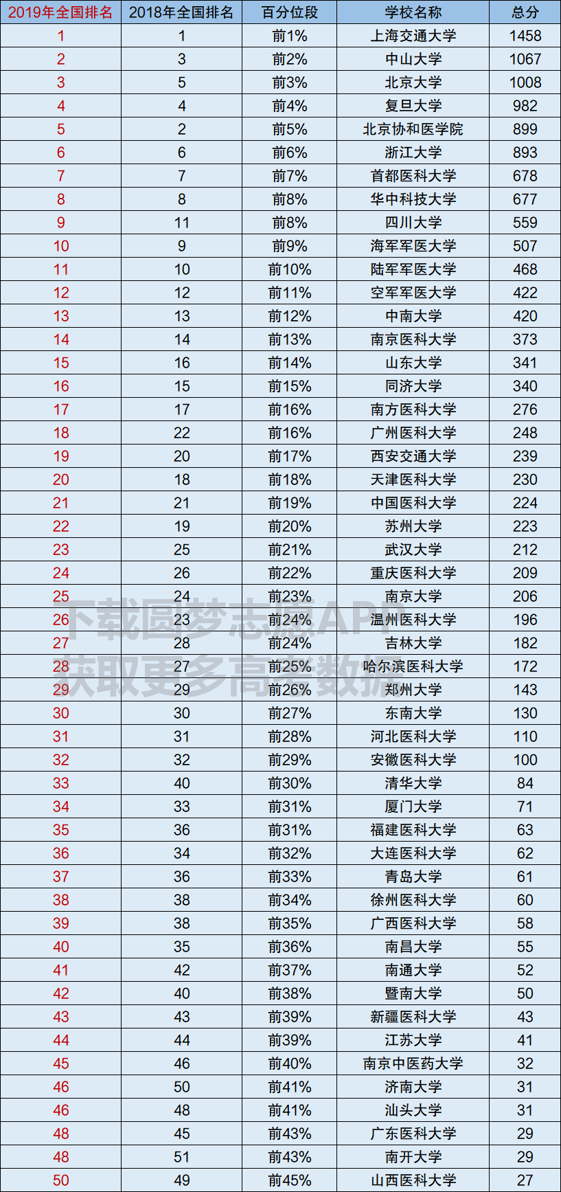 我们参考了2019年校友会和软科中国一流学科排名,整理了临床医学50强排名,具体如下。