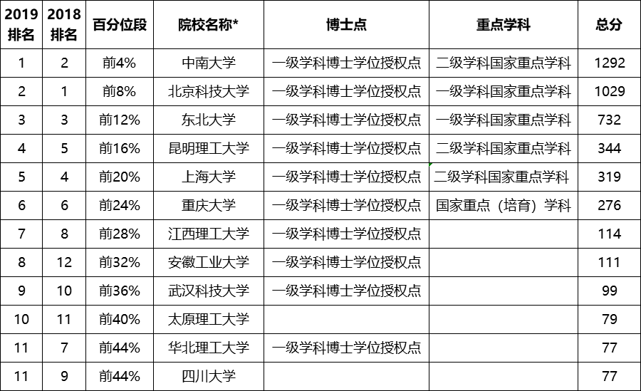 由于各大机构2020年的高校学科排名还未曾公布,这里以《软科中国最好学科排名2019-冶金工程》为例,参考冶金专业全国高校排名情况。2019年,中南大学的冶金工程专业排名较前一年更进一步,位列全国第一;北京科技大学则下滑一名,排在第二;而东北大学保持第三不变。具体排行榜如下,可供参考: