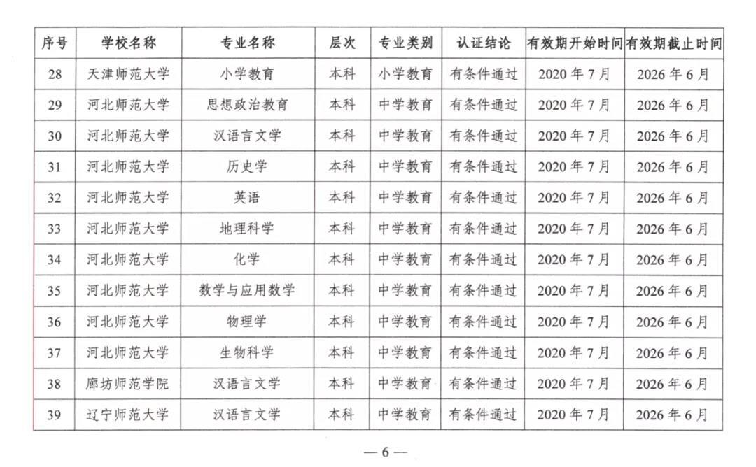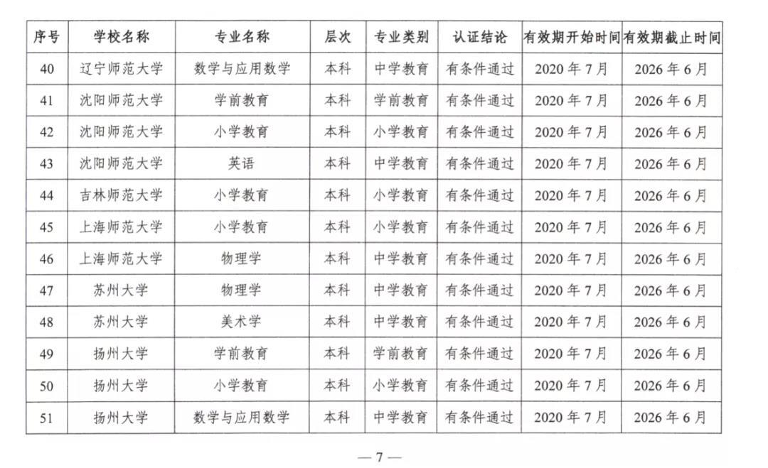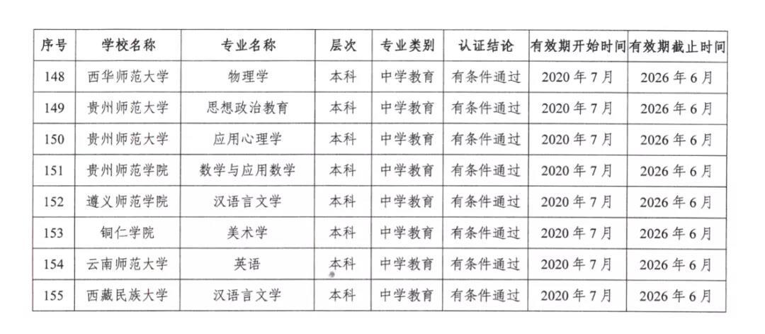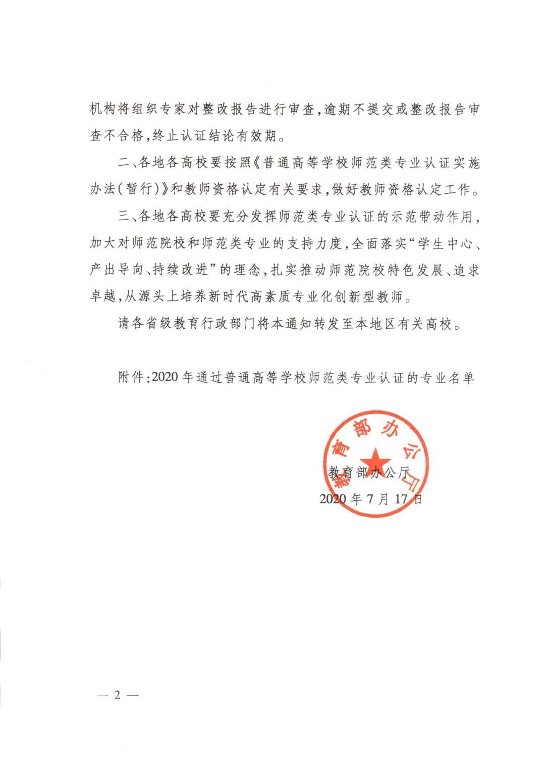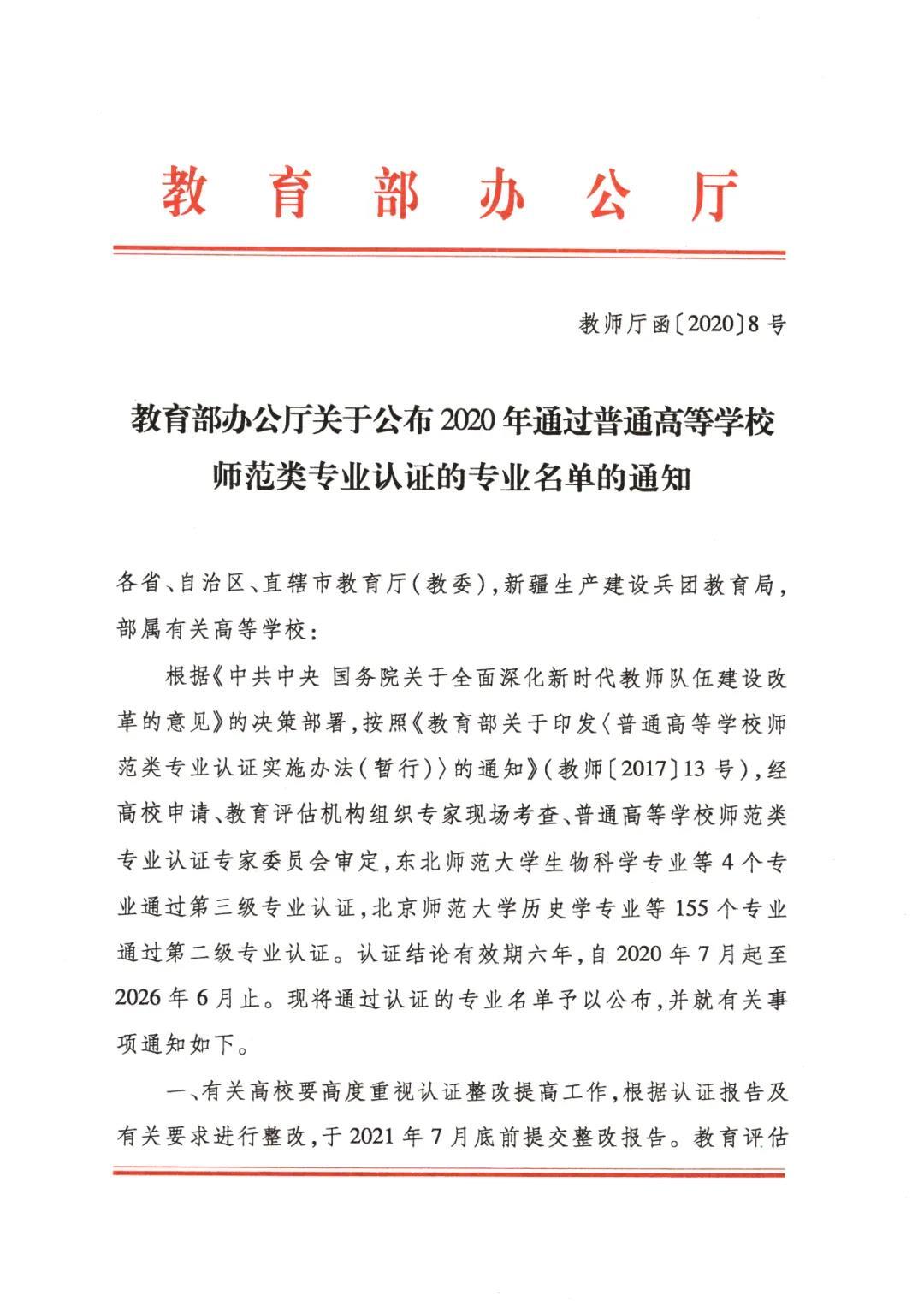 2020年7月17日,教育部公布2020年通过普通高等学校师范类专业认证的专业名单。