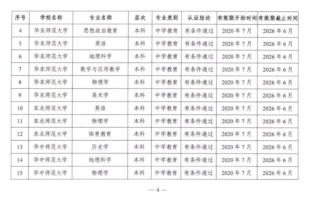 根据《中共中央 国务院关于全面深化新时代教师队伍建设改革的意见》的决策部署,按照《教育部关于印发〈普通高等学校师范类专业认证实施办法(暂行)〉的通知》(教师〔2017〕13号),经高校申请、教育评估机构组织专家现场考查、普通高等学校师范类专业认证专家委员会审定,东北师范大学生物科学专业等4个专业通过第三级专业认证,北京师范大学历史学专业等155个专业通过第二级专业认证。认证结论有效期六年,自2020年7月起至2026年6月止。现将通过认证的专业名单予以公布,并就有关事项通知如下。
