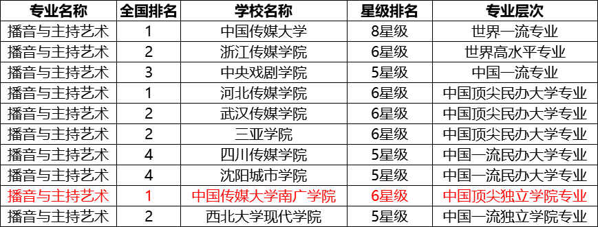专业荣誉:南京传媒学院的播音与主持艺术是国内同类高校六星级专业和江苏省“十二五”时期该领域唯一一个省级重点建设专业,也是学校唯二(另一个是广播电视编导)的江苏省一流专业。在《校友会2019中国戏剧与影视学类一流专业排名(5★以上)》中,南京传媒学院(转设前为中国传媒大学南广学院)在同类高校中排名全国第一!