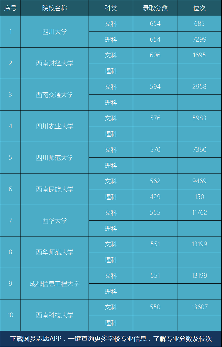 在该批次招生的四川院校中,有汉语言文学专业招生计划的高校共有10所,其中以四川大学的录取分数最高,并且也只有四川大学的该专业才是文理兼收。