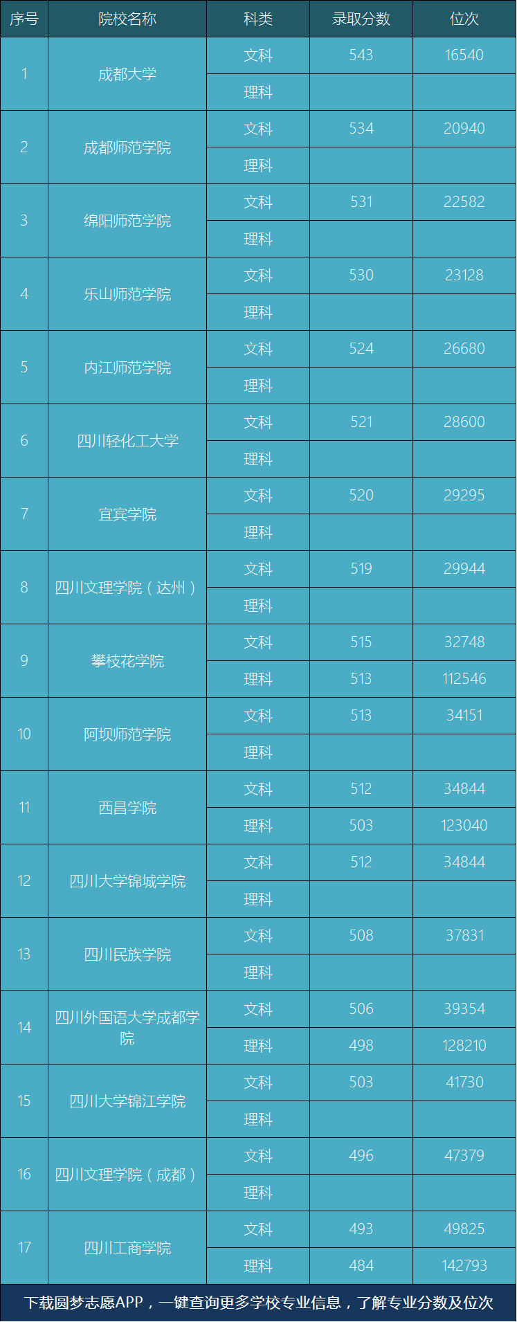 在该批次招生的四川院校中,有汉语言文学专业招生计划的高校共有17所,其中成都大学的文科录取分数最高,而攀枝花学院的理科录取分数最高。