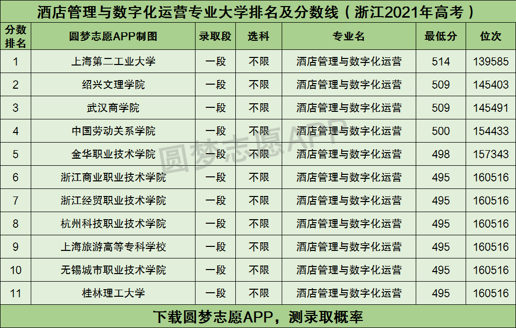 根据上图的分数线排名可知,在浙江考生心中,酒店管理与数字化运营专业比较好的大学有: