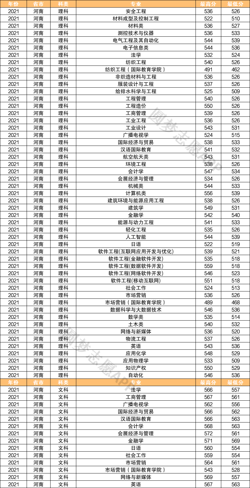 下面是2021年中原工学院各专业在河南本省的录取分数线: