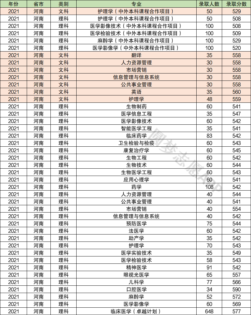 下面是2021年新乡医学院各专业在河南本省的录取分数线:
