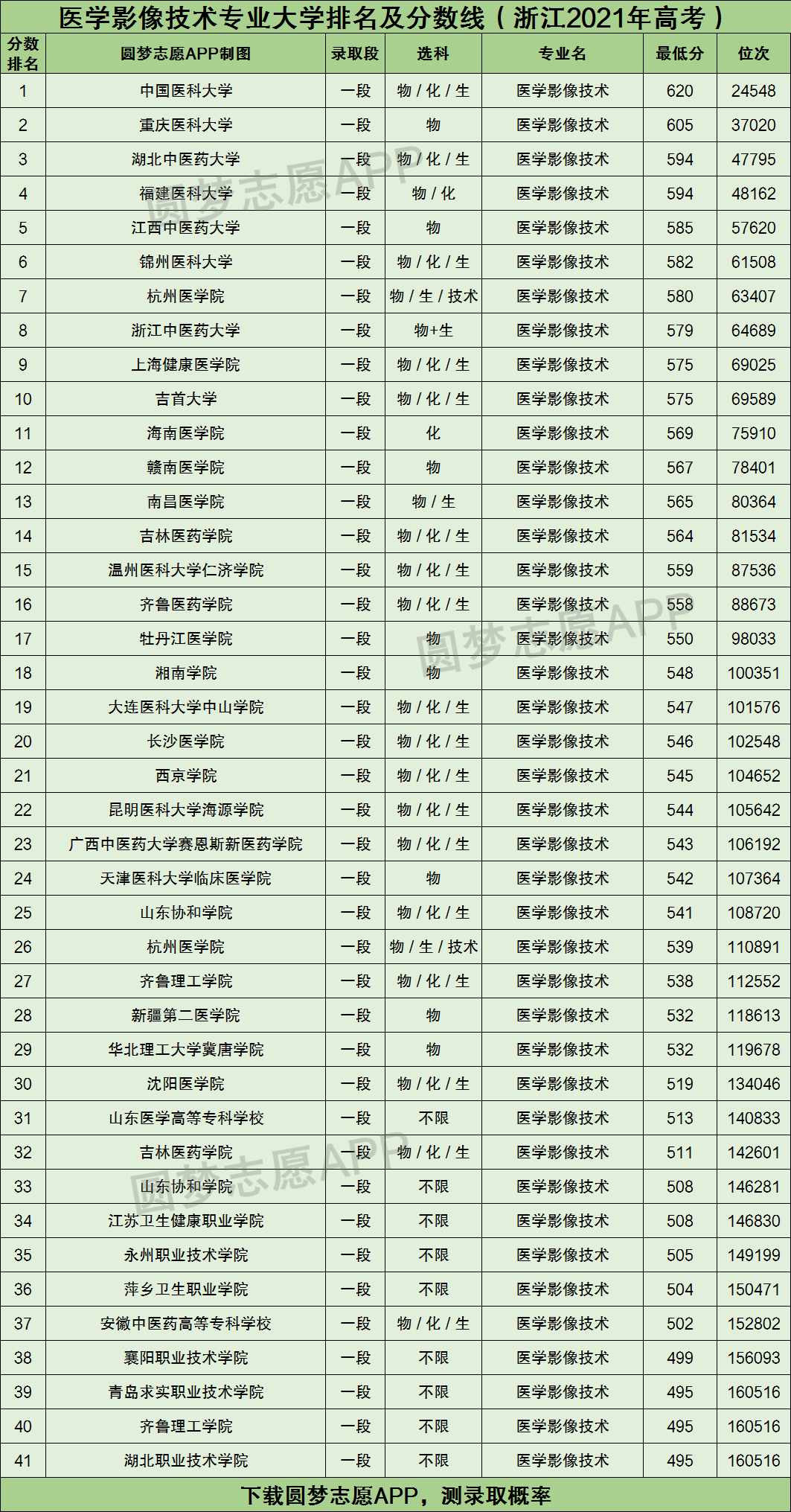由于本文篇幅有限,仅为大家展示医学影像技术专业2021年在浙江高考的分数线排名榜单。如果你想查看医学影像技术专业开设院校在你的高考省份的分数线排名,请直接下载圆梦志愿APP查询。
