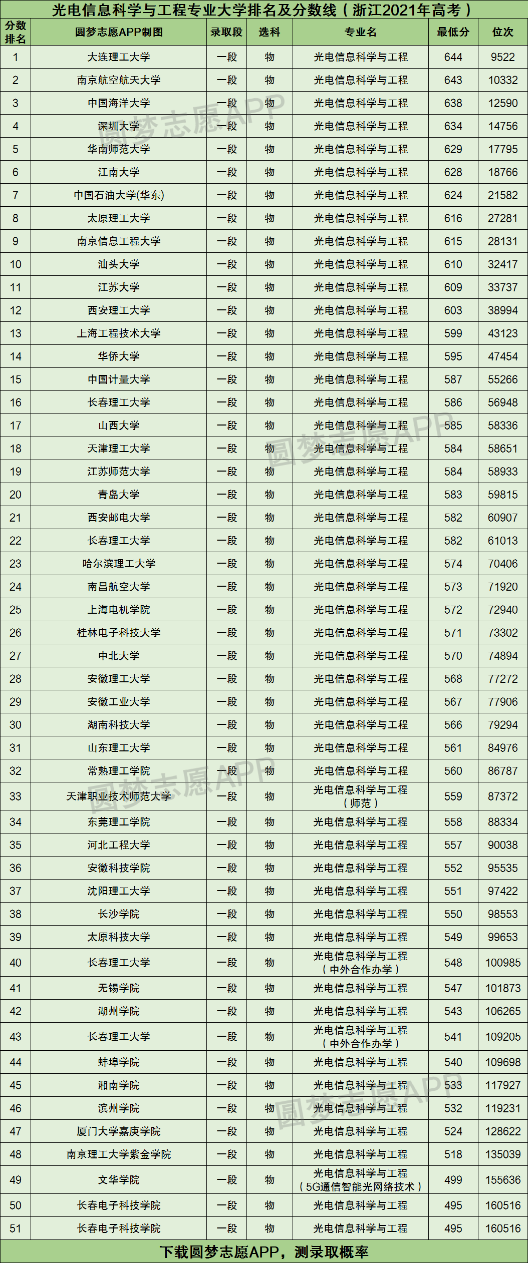 由于本文篇幅有限,仅为大家展示光电信息科学与工程专业2021年在浙江高考的分数线排名榜单。如果你想查看光电信息科学与工程专业开设院校在你的高考省份的分数线排名,请直接下载圆梦志愿APP查询。