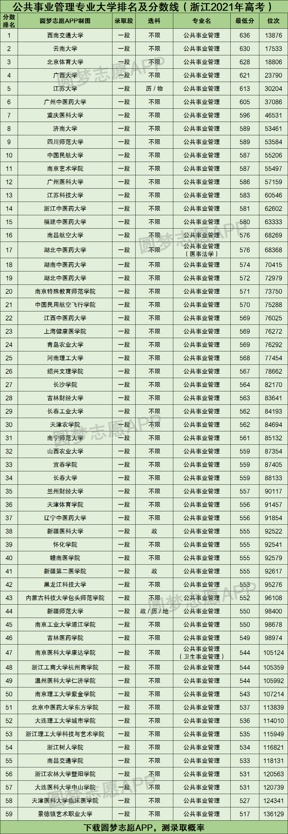 由于本文篇幅有限,仅为大家展示公共事业管理专业2021年在浙江高考的分数线排名榜单。如果你想查看公共事业管理专业开设院校在你的高考省份的分数线排名,请直接下载圆梦志愿APP查询。