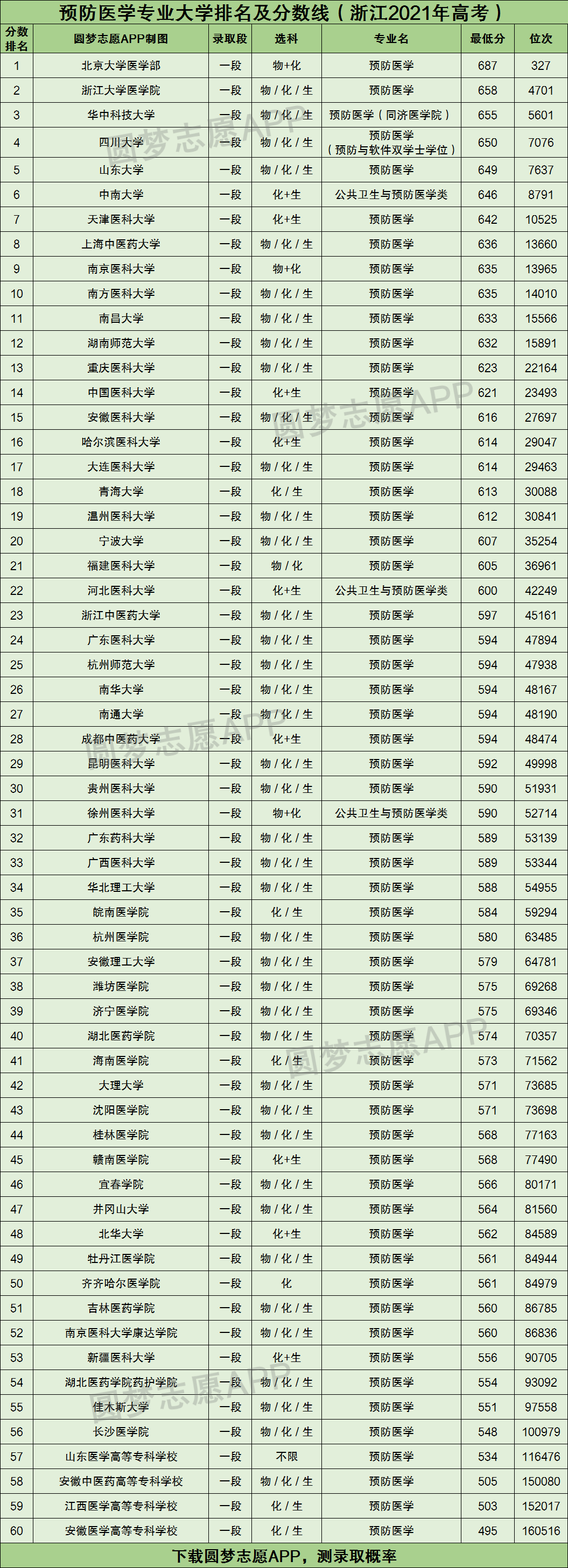 由于本文篇幅有限,仅为大家展示预防医学专业2021年在浙江高考的分数线排名榜单。如果你想查看预防医学专业开设院校在你的高考省份的分数线排名,请直接下载圆梦志愿APP查询。