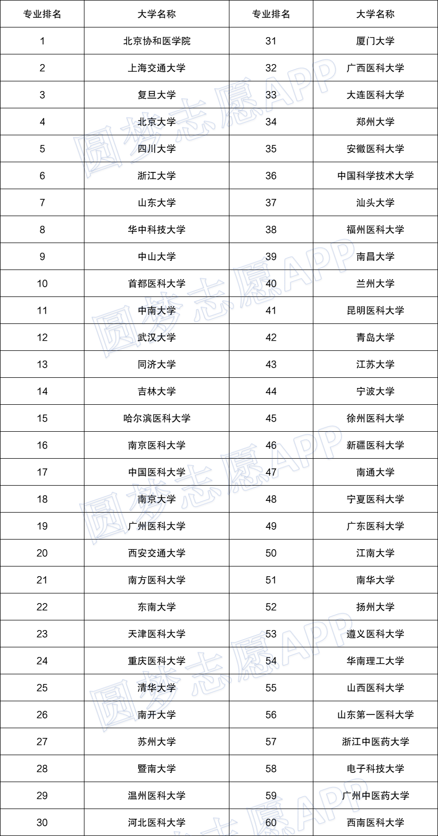 2、临床医学60强(数据来源于软科)