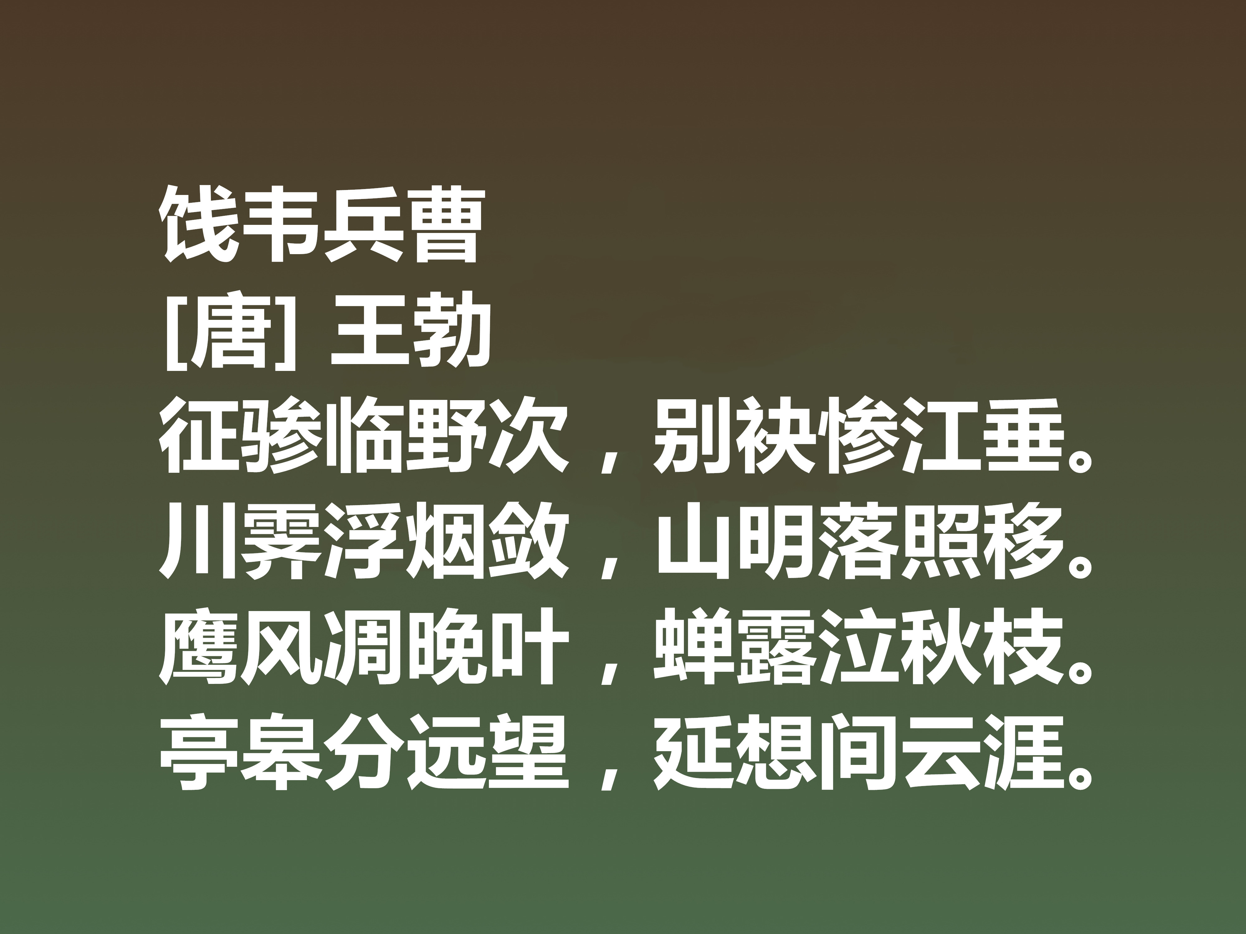 在用韵和平仄方面,王勃也有涉猎,在诗文对仗方面,也极为重视。他还擅长在诗歌中运用典故,具备蕴藉含蓄的特点,加之个性意象,让诗歌更具表现力和想象力。总之,在诗歌艺术上,创新上,贡献上,王勃均做出不朽的功绩,今天我们就一起来欣赏王勃十首佳作,体会诗人的精神世界,体会多样的艺术风格。