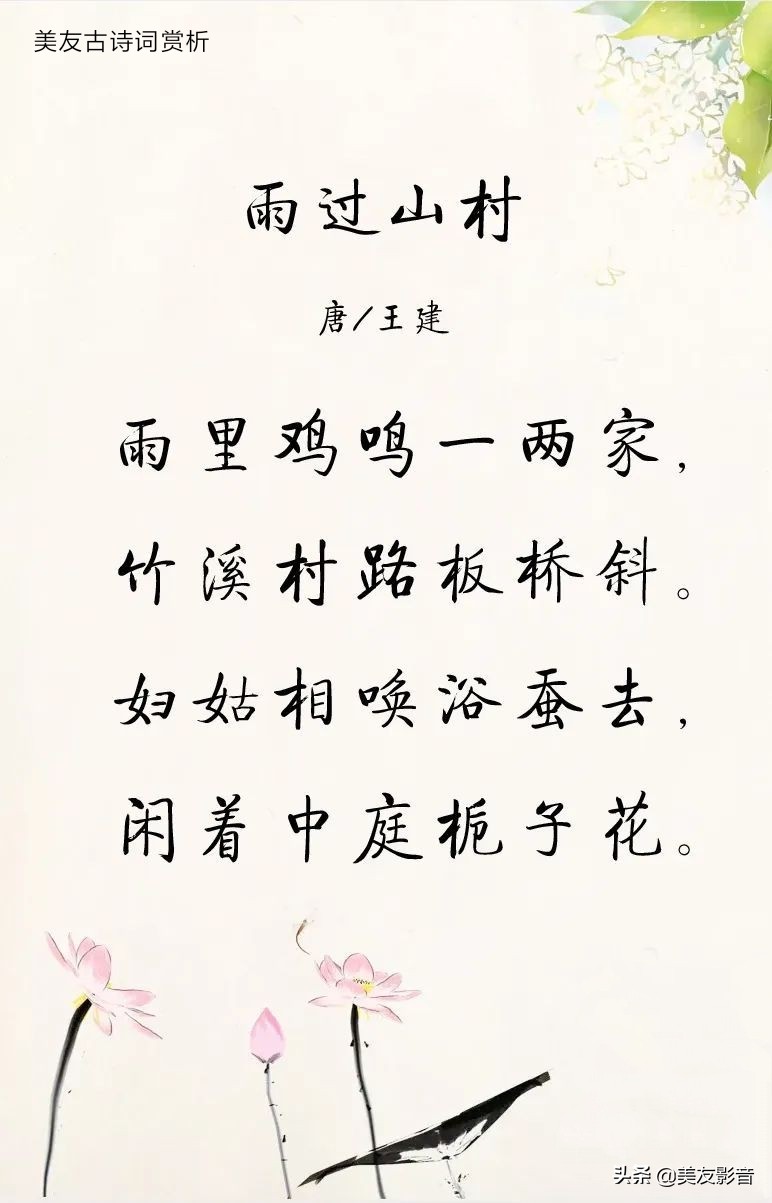 唐朝的山水田园诗总是在充满劳动气息的同时,还能如此的富有诗情画意。王建的这首小诗便是如此。“雨里鸡鸣一两家”,诗刚下笔便把我们引入山村之中:诗人在阴雨的天气里,看远处的天色明暗交替地变幻着。因为是山村,所以村民的房屋都比较松散。因此,本来鸡犬相闻的情景,在这里便变为独特的“鸡鸣一两家”。声音上已经告诉我们环境的清幽了,但远远不够体现山村之美。“竹溪村路板桥斜”,潺潺的小溪旁是青翠欲滴的竹林,竹林间是一条通向远方的小路。横跨小溪的是曲折的石板桥。试想诗人在绵绵细雨中沿着斗折蛇行的小路一边走,一边听那萧萧竹韵,潺潺溪声,该有多么欢畅舒心呢?山林之中已经足够幽美,再加上通幽的小路,简直就是世外桃源了。